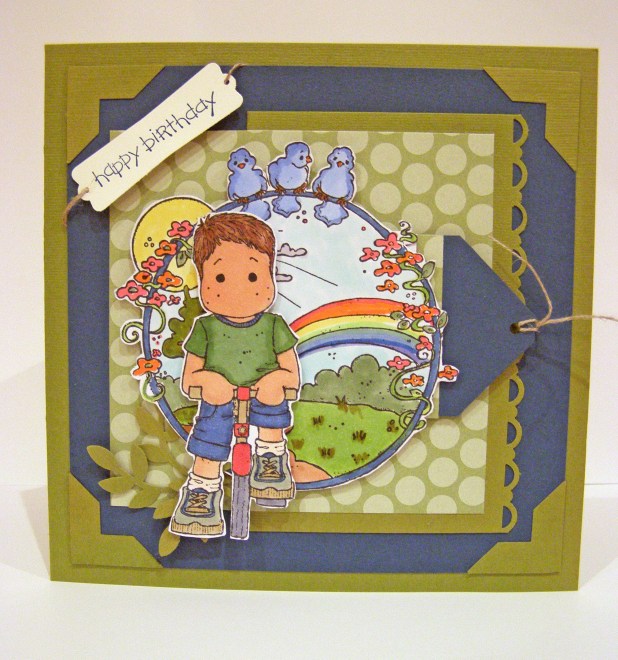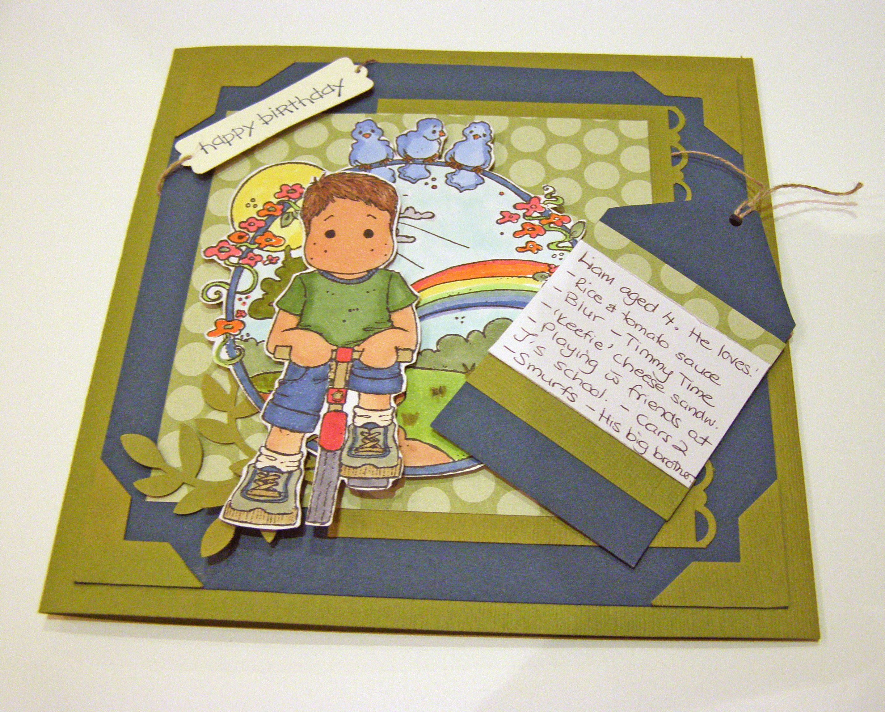This is my first time joining in the Magnolia Down Under Challenges. What a lovely sketch this week! And good timing as I had to make a card for my son’s 4th birthday tomorrow. When I saw the tag element I thought it would be nice to write down some of his favourite things. Since I hardly scrapbook anymore, I might have to start including a tag or journalling note in every birthday card from now on :).