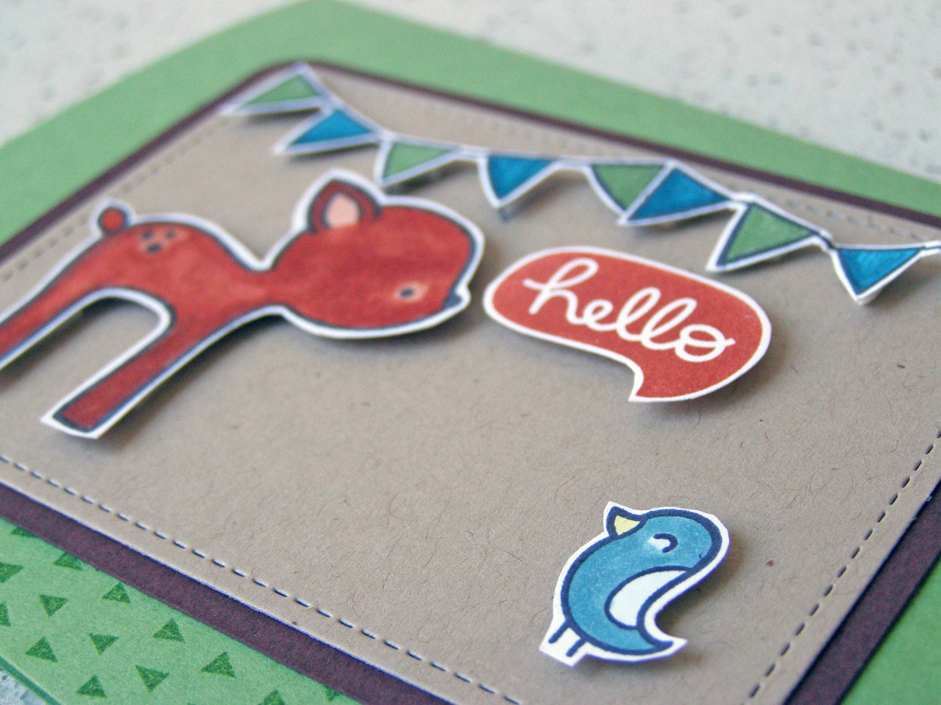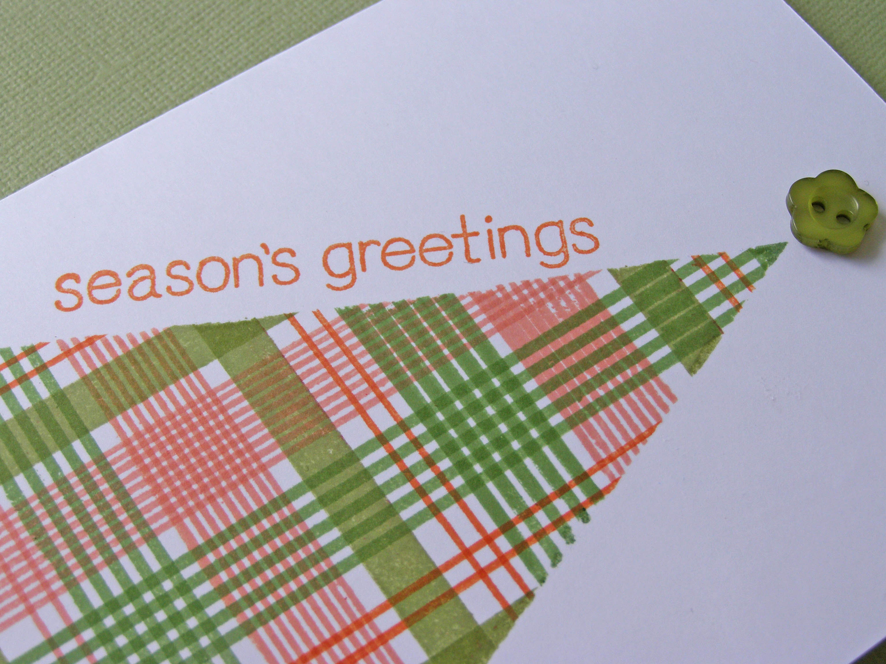 Ever since I saw Kristina Werner’s wonderful plaid stamping card here I’ve been wanting to try this technique. I got my chance today when I unpacked some new goodies I’d ordered from WPlus9 and Papertrey Ink. I used two of the stripes from the WPlus9 Country Charm set and two from Papertrey Ink’s Super Stripes set to create this plaid. I’m a recent convert to photopolymer stamps, and have to say that this technique really demonstrates the benefits of good quality clear stamps. I was able to line all the stripes up without a stamp-a-ma-jig in sight ;).