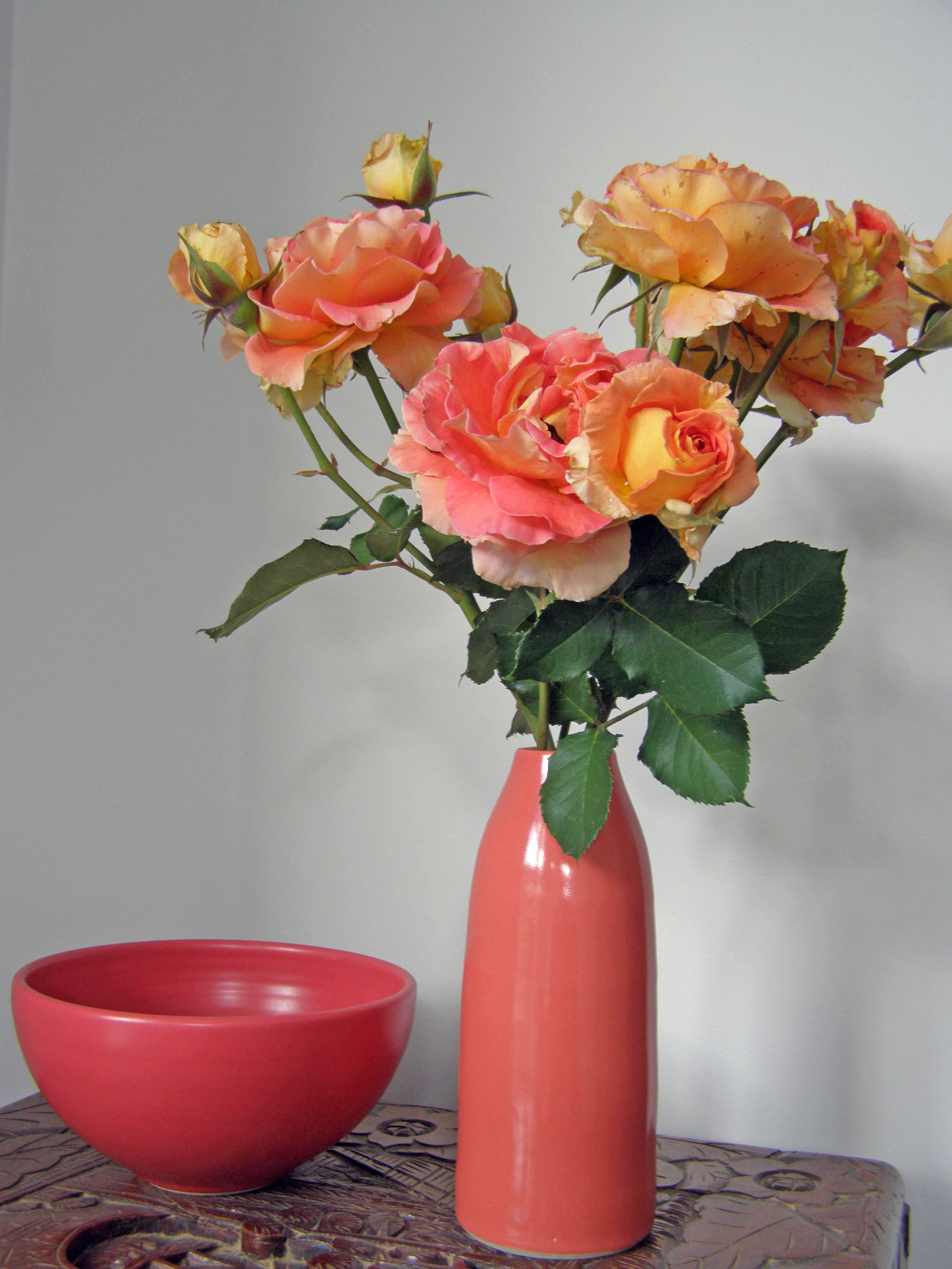 Aren’t the colours in this photo simply gorgeous? For the inks I used Stampin Up Tangerine Tango, Crisp Cantaloupe, Wild Wasabi and Pear Pizzazz. The mood board reminded me of the beautiful cut roses my Mum gave me yesterday fresh from her garden. I placed them in one of my vases from a favourite local store, Bison Ceramics.