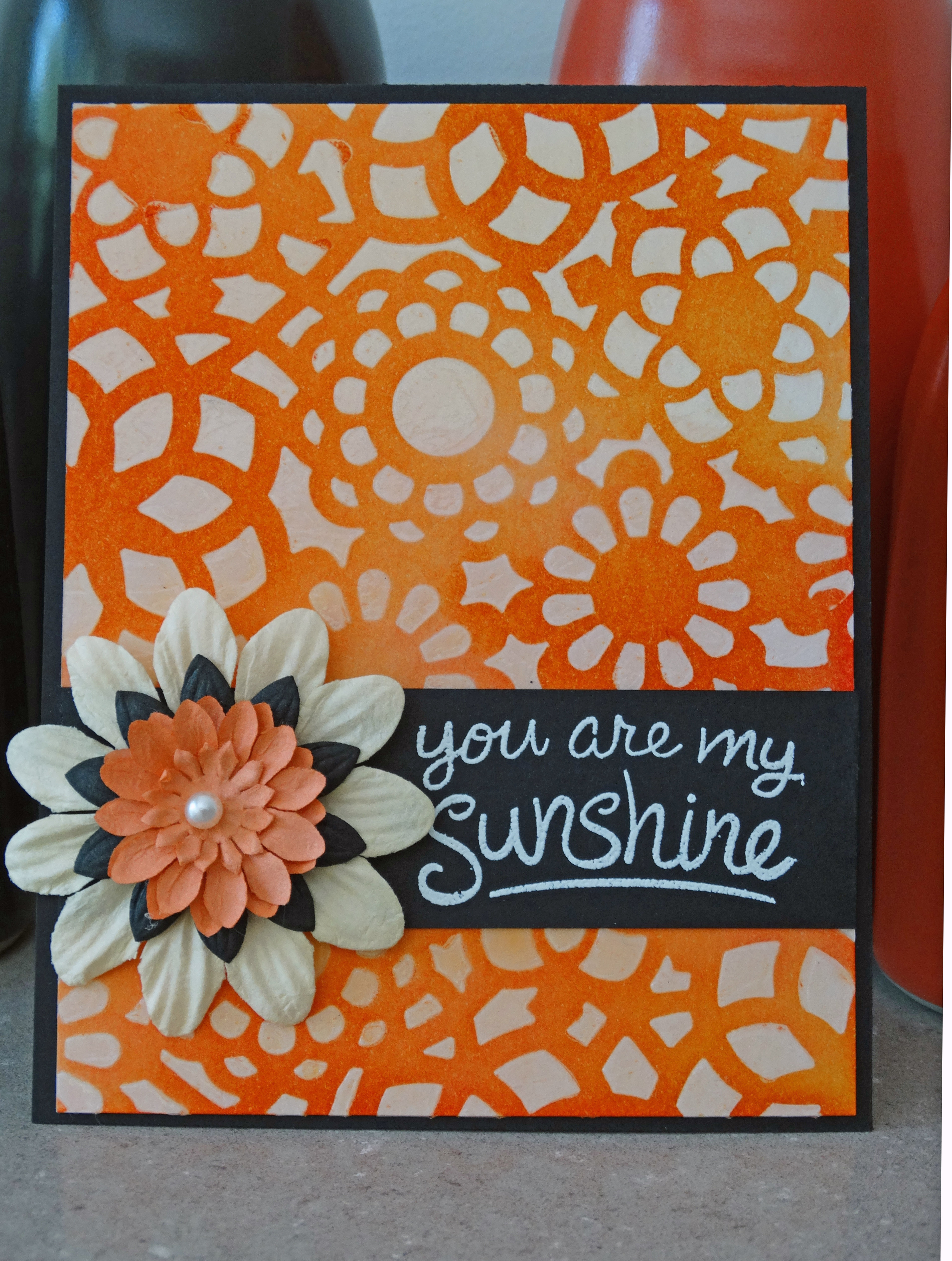 Dreamworks Translucent Embossing Paste, Heidi Swapp Doily Flowers stencil, Tim Holtz Wild Honey, Ripe Persimmon and Festive Berries Distress Inks, Tim Holtz Distress Watercolor Cardstock, SU black cardstock, Lawn Fawn Sunny Skies, Hero Arts white embossing powder, Prima and other flowers.